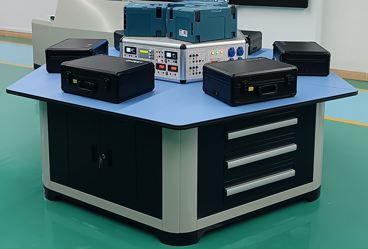 (二)六邊形電源控制屏:電源控制屏采用六邊形結構,與工作臺相對應?蚣懿捎脙(yōu)質(zhì)鞍鋼盒裝鋼板,經(jīng)過(guò)機械加工成型,外表面噴涂彩色環(huán)氧聚塑。六個(gè)作業(yè)面配置有實(shí)訓電源控制系統,控制面板具有漏電保護、短路保護功能。電源控制屏頂面采用10mm厚的鋁框包邊,內置有直徑為850mm的多角度公共操作平臺。每工位電源控制屏功能: