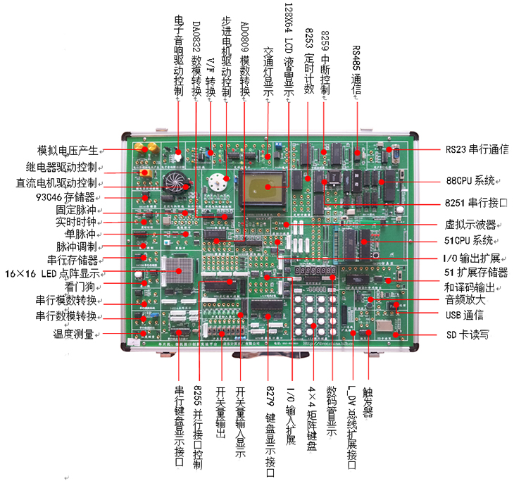 含箱體、電源、51單片機系統和微機接口8088系統以及標配實(shí)驗電路 |