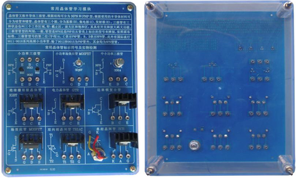 對常用晶體管的分類(lèi)及管腳判斷進(jìn)行了介紹,展示半導體三極管、達林頓復合管、場(chǎng)效應管MOSFET、絕緣柵雙極晶體管IGBT,單向晶閘管SCR,雙向晶閘管TRIAC的圖示,列舉了常用9013、3DJ6F的識讀方法;展示了小功率三極管、塑封大功率三極管、達林頓復合管、場(chǎng)效應管MOSFET、絕緣柵雙極晶體管IGBT,單向晶閘管SCR,雙向晶閘管TRIAC等實(shí)物,提供檢測接口。